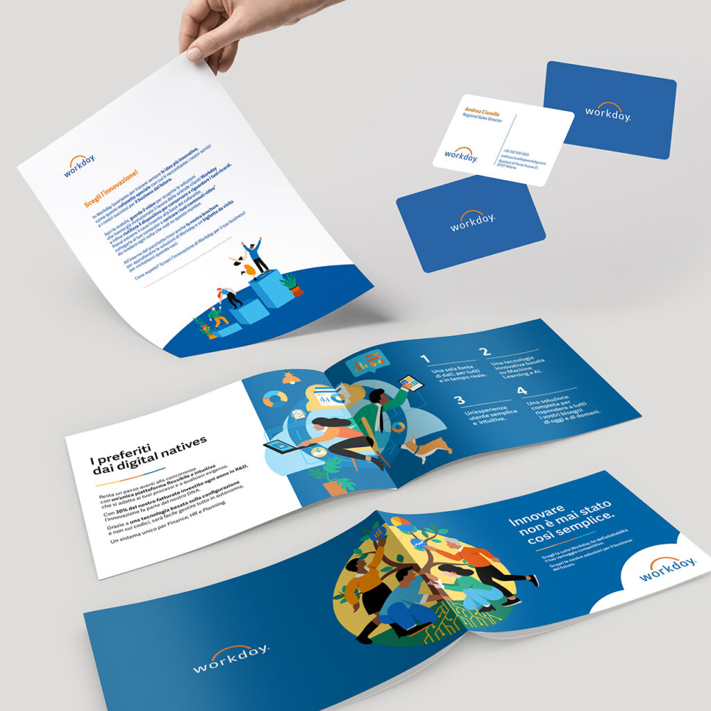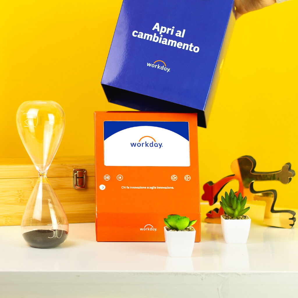Abbiamo creato un box cubico con schermo LED integrato che, all’apertura, avvia automaticamente un video emozionale. Le testimonianze dei clienti hanno raccontato storie autentiche di innovazione, semplificazione e crescita aziendale. Un invio curato in ogni dettaglio – dal design alla logistica – che ha generato stupore e rafforzato la percezione di Workday come brand innovativo.