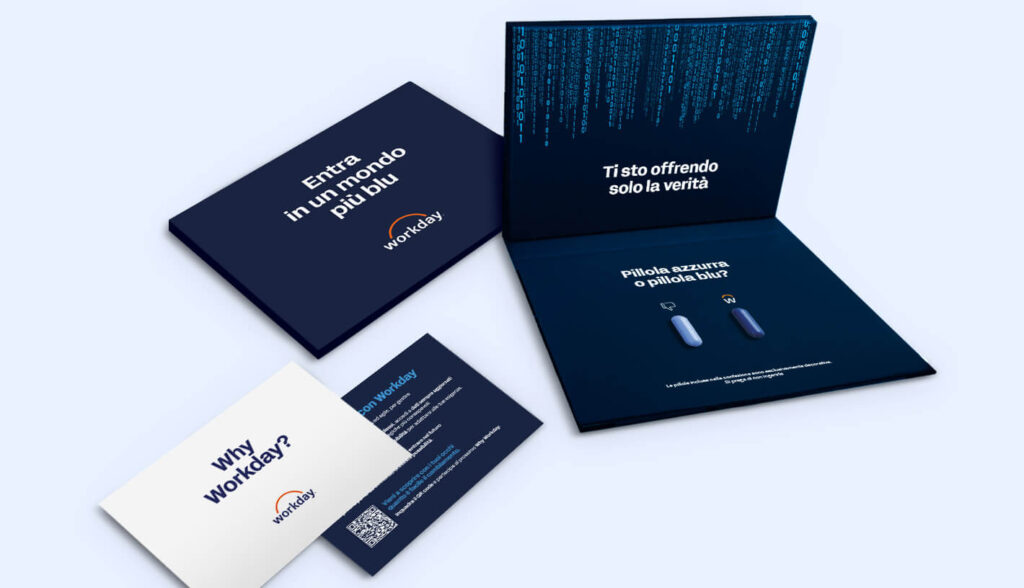 Abbiamo realizzato uno speciale cofanetto che, una volta aperto, accoglieva il destinatario con la voce di Massimo Corvo – celebre doppiatore di Laurence Fishburne – e una domanda cruciale: pillola azzurra o pillola blu? Restare nel passato o scegliere il mondo della semplicità con Workday. Packaging curato, storytelling cinematografico e un tone of voice emozionale hanno trasformato un invio B2B in un’esperienza memorabile.